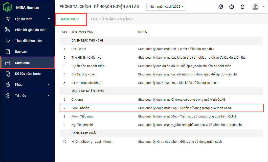 Giúp đơn vị thiết lập danh mục Loại – Khoản để phục vụ cho việc lập dự toán và ban hành danh mục cho cấp dưới.