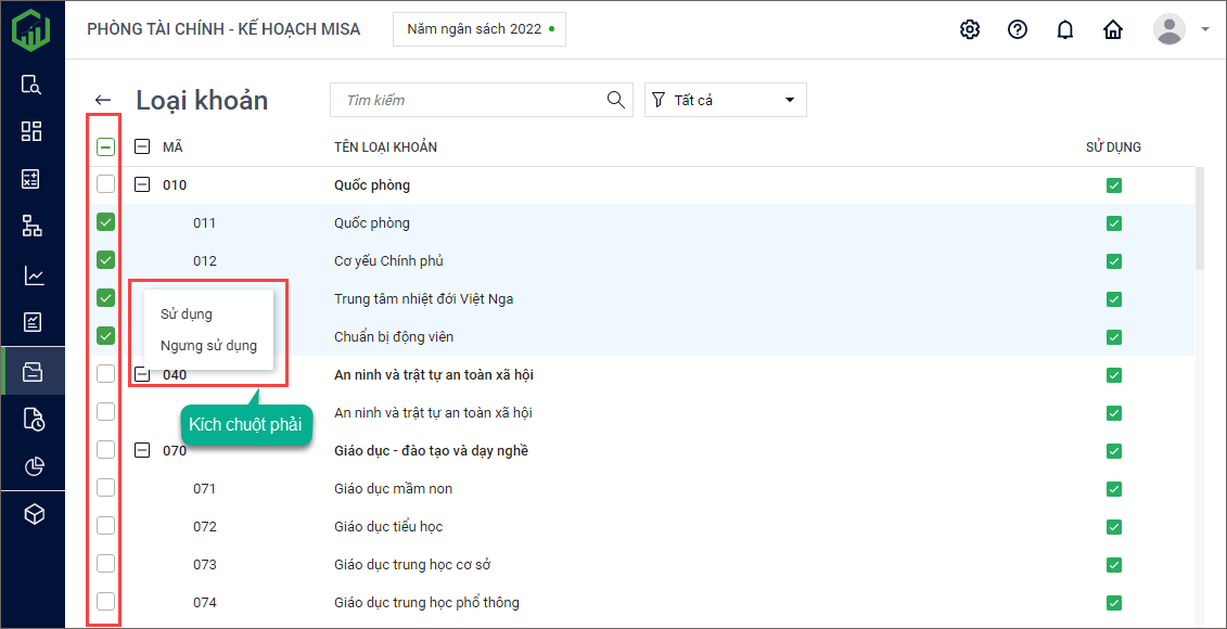 - Kích chuột phải để chọn Sử dụng hoặc Ngừng Sử dụng cho các khoản đã tích chọn.