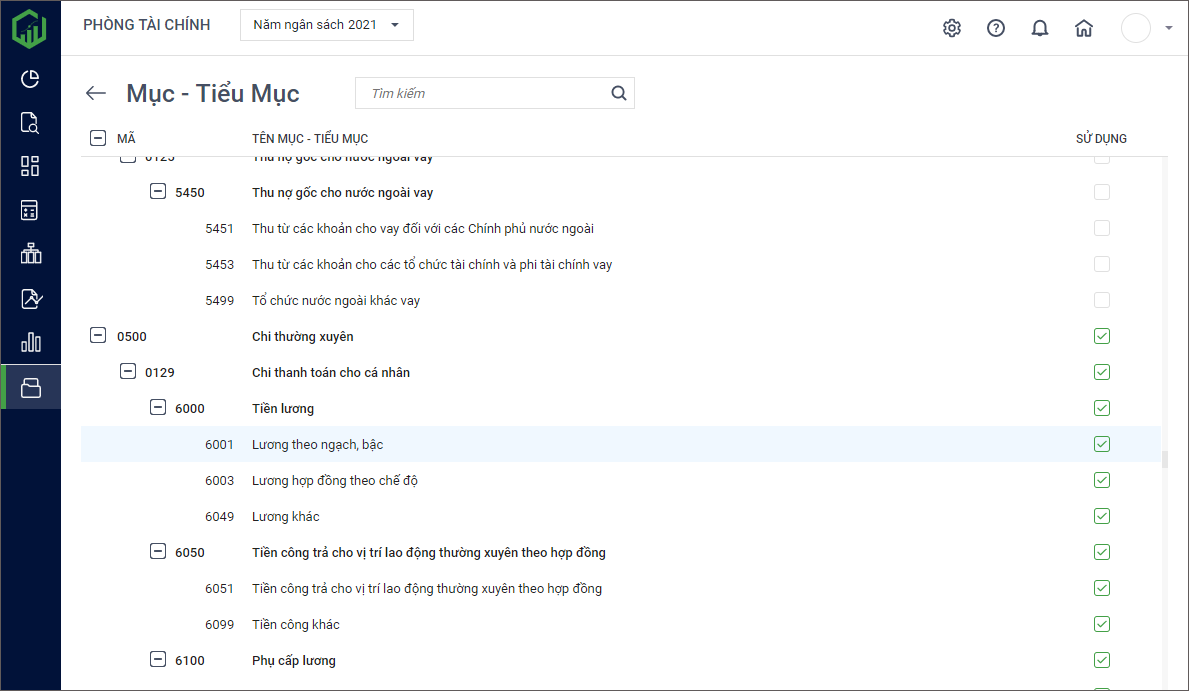 Phần mềm đã lấy lên danh mục Mục lục ngân sách cấp trên ban hành theo quy định của TT 324/2016/TT-BTC, đơn vị có thể tích chọn/bỏ tích chọn Mục – Tiểu mục ban hành cho cấp dưới lập dự toán.