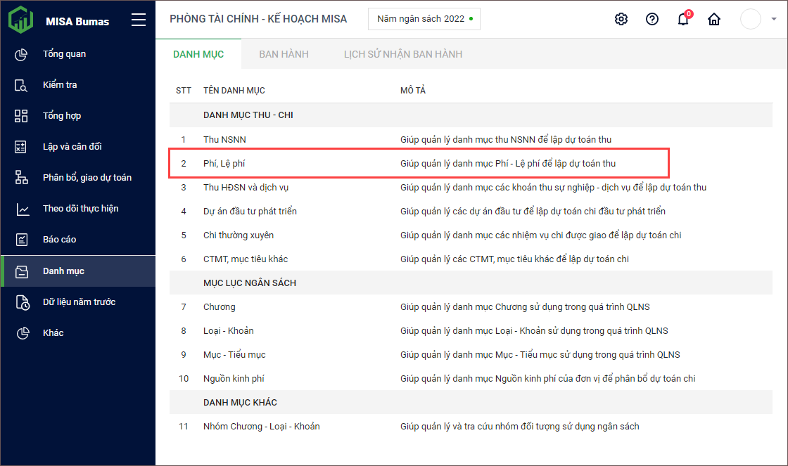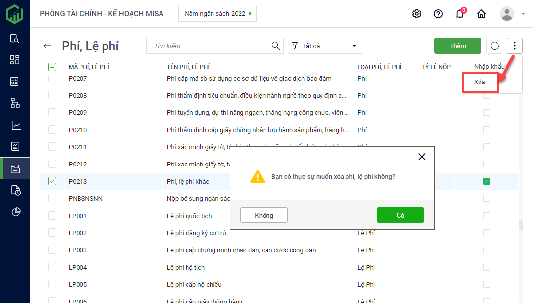Lưu ý: Đơn vị chỉ xóa được danh mục Phí, lệ phí tự thêm mới, không xóa được danh mục cấp trên ban hành và danh mục đã phát sinh dữ liệu (tức là danh mục đã được lập dự toán).