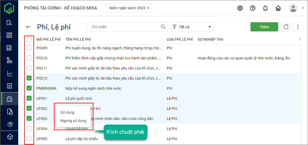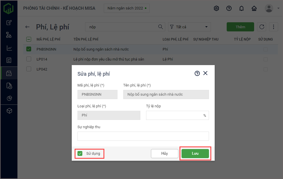 Giúp đơn vị thêm mới, tích chọn sử dụng/không sử dụng danh mục thu phí, lệ phí để gửi cho cấp dưới lập dự toán.