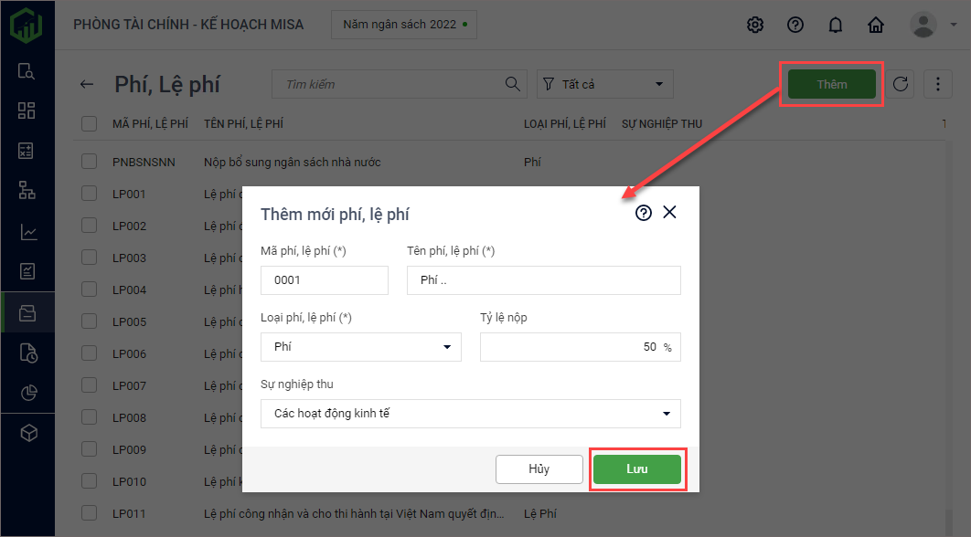 2. Khai báo các thông tin trên màn hình thêm mới danh mục Phí, Lệ phí.