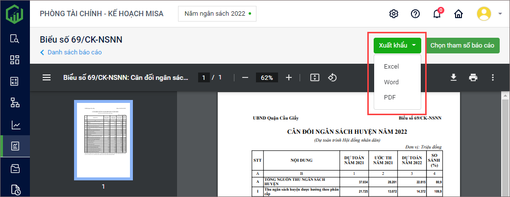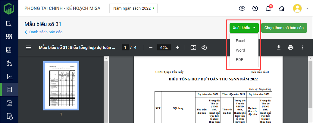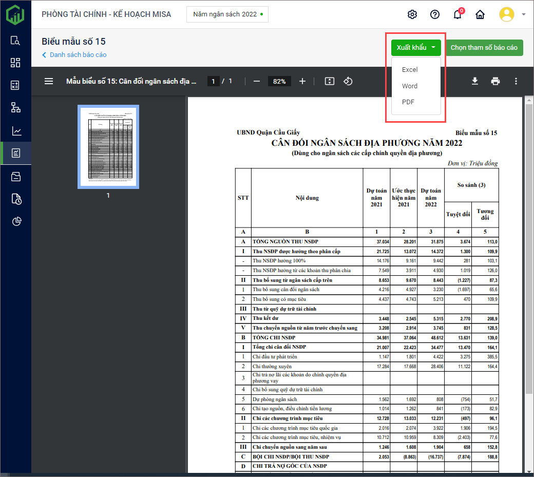 5. Để xuất khẩu báo cáo, nhấn Xuất khẩu và chọn định dạng file cần xuất khẩu ra Word, Excel, PDF.