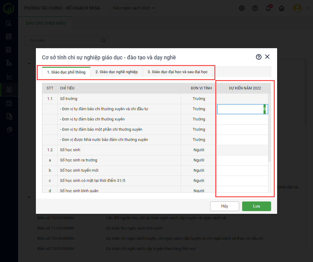 2. Chọn lĩnh vực để nhập Cơ sở tính vào cột Dự kiến năm 2022.