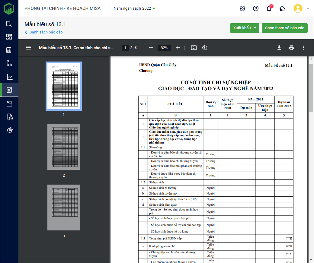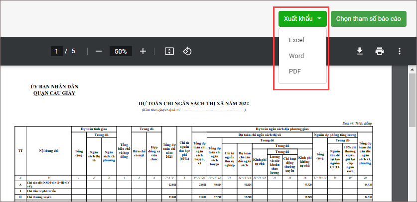 5. Để xuất khẩu báo cáo, anh/chị nhấn Xuất khẩu và chọn định dạng file cần xuất khẩu ra Word, Excel, PDF.