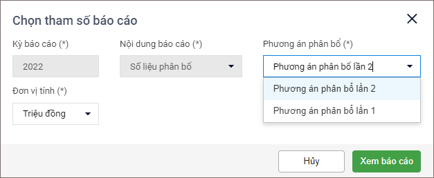 6. Để xem báo cáo với tham số khác, nhấn Chọn tham số báo cáo. Chọn lại tham số và nhấn Xem báo cáo.