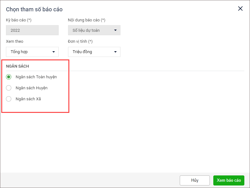 - Chọn Ngân sách là Ngân sách Toàn Huyện, Ngân sách Huyện, Ngân sách Xã.