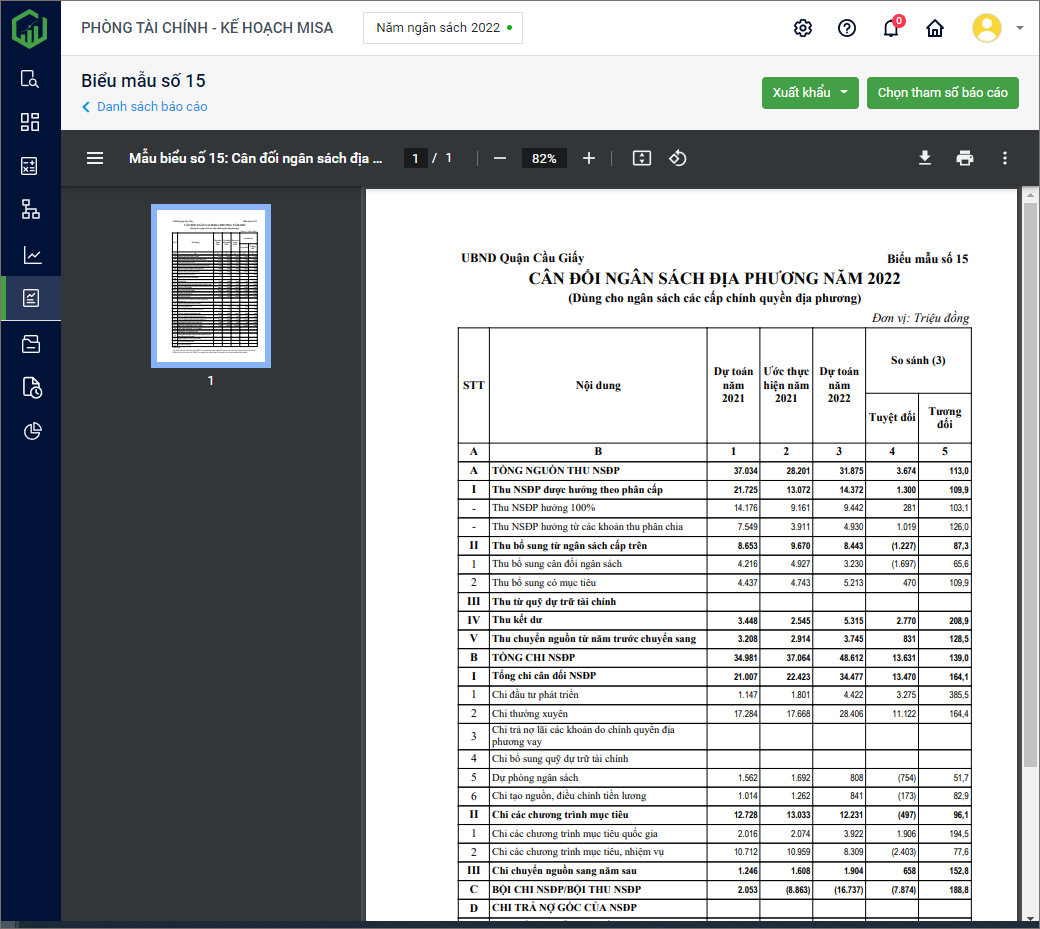 Ví dụ: In Mẫu biểu số 15: Cân đối ngân sách địa phương.
