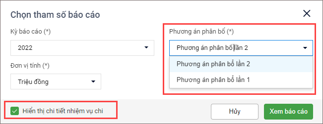 - Chọn Xem theo: Tổng hợp hay Chi tiết đơn vị.