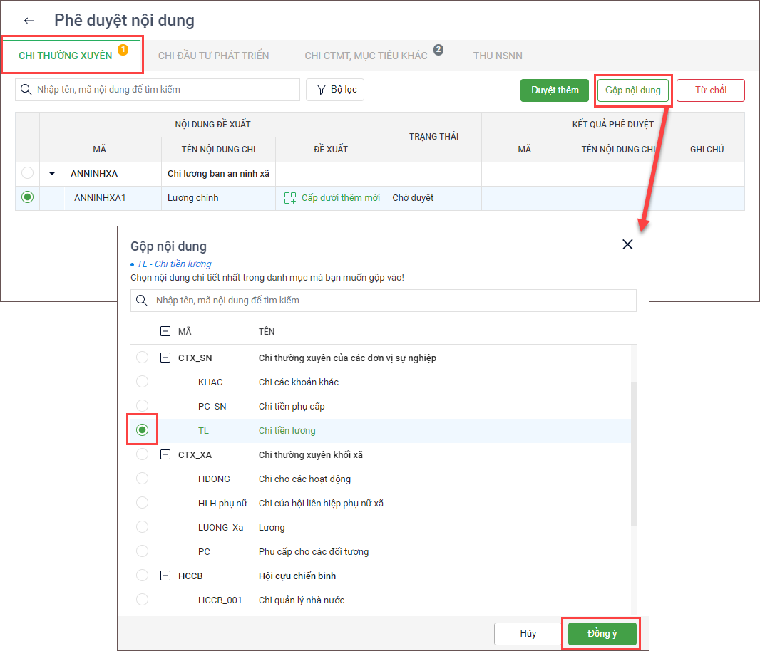- Xem Kết quả phê duyệt bao gồm: Mã, Tên nội dung Thu/chi, Ghi chú là Đã gộp từ… với…
