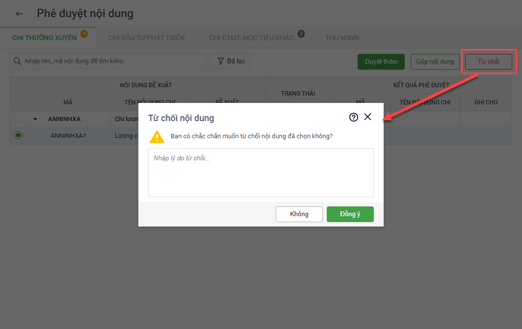 - Nếu chọn Từ chối: Phòng tài chính từ chối phê duyệt nội dung cấp dưới đề xuất và nội dung này sẽ không xuất hiện tại phần Dự toán kiểm tra nữa.