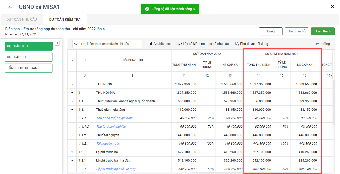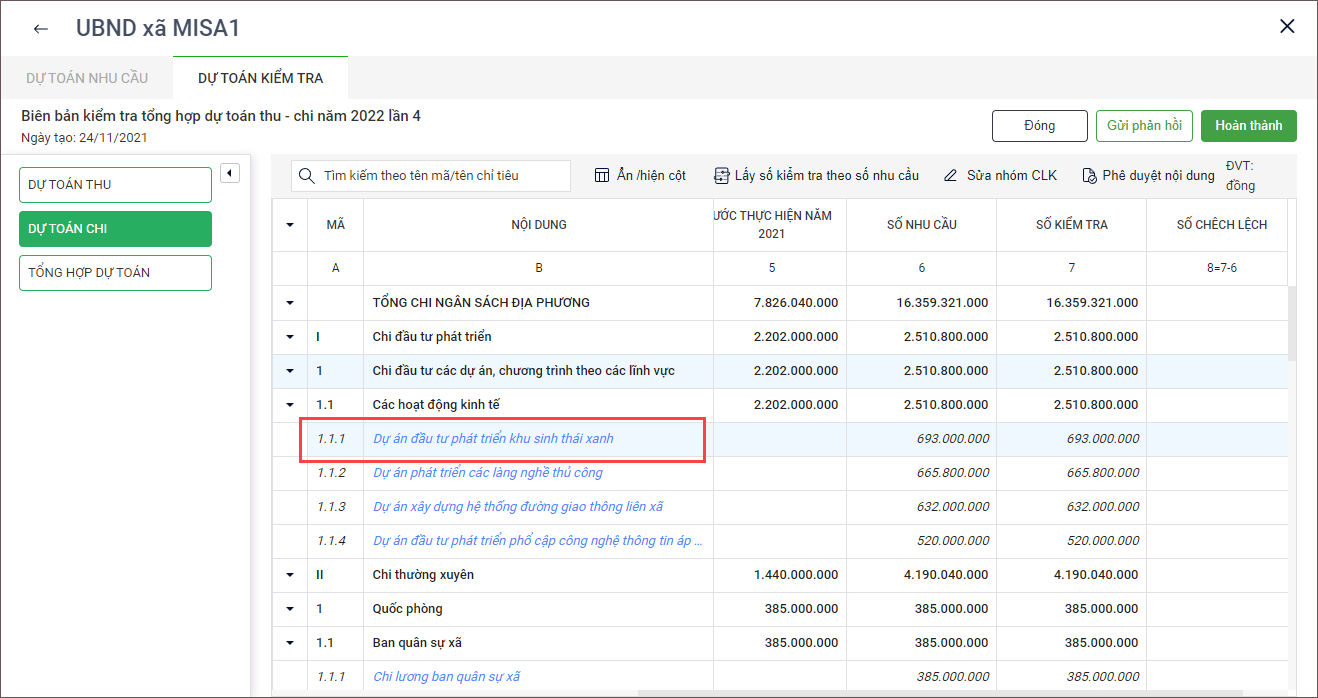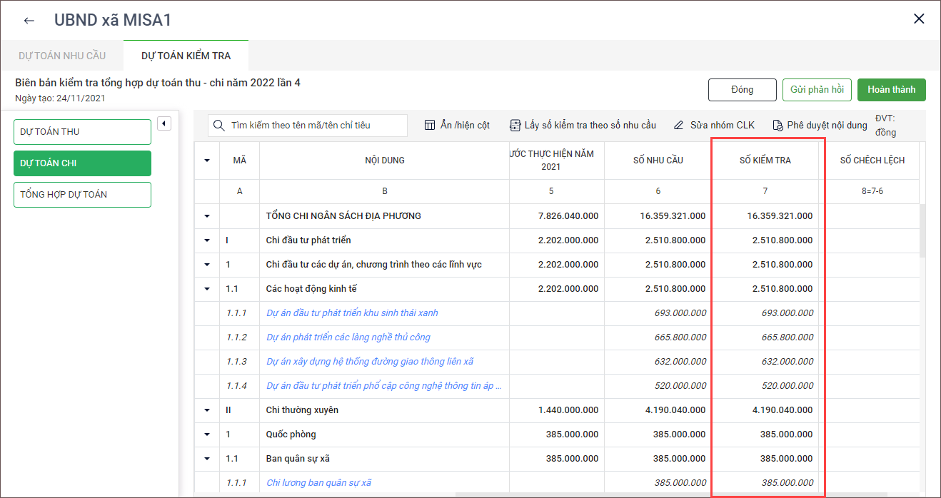 2. Xem số liệu Dự toán năm, Số kiểm và Chênh lệch để tiến hành Gửi phản hồi hoặc xác nhận Hoàn thành.