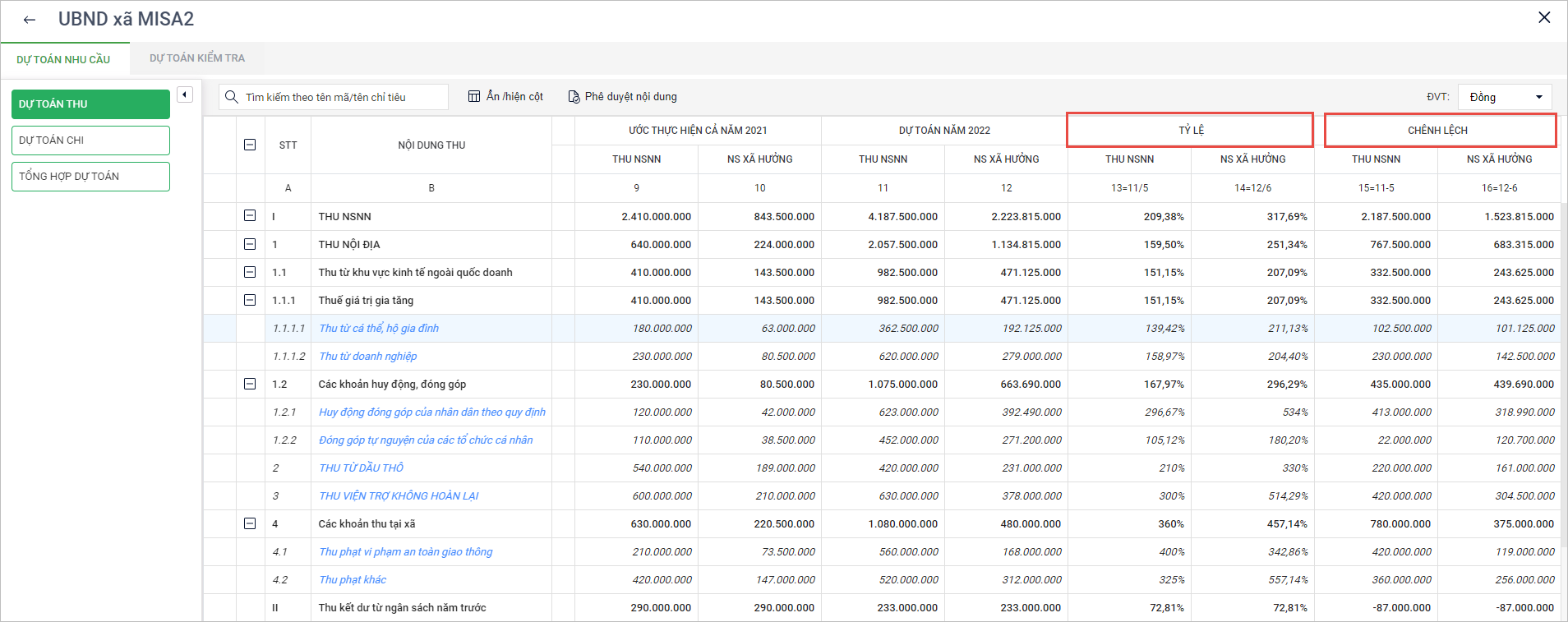 2. Đơn vị xem số liệu dự toán năm trước (nếu như đã được nhập khẩu), tỷ lệ từ dự toán năm nay so với năm trước đó tại cột Tỷ lệ và số liệu chênh lệch tại cột Chênh lệch.