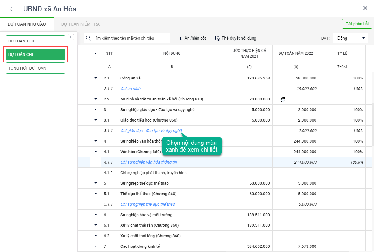 2. Chọn nội dung màu xanh để xem chi tiết các số liệu của nội dung dự toán chi.