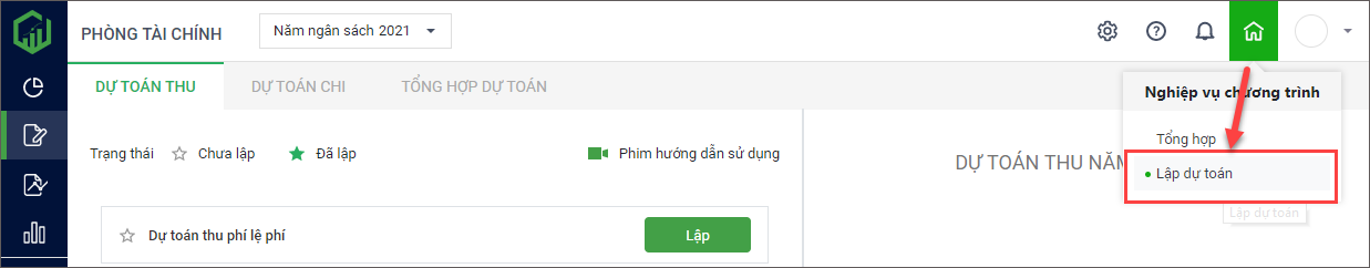 Lập dự toán Giúp đơn vị lập dự toán cho năm dự toán. Chọn biểu tượng ngôi nhà (home), chọn Lập dự toán. Sau đó, thực hiện lập dự toán: Lập dự toán thu Lập dự toán chi Tổng hợp dự toán Lượt xem: 29 Cập nhật 12/01/2021 Bài viết này hữu ích chứ? Có Không