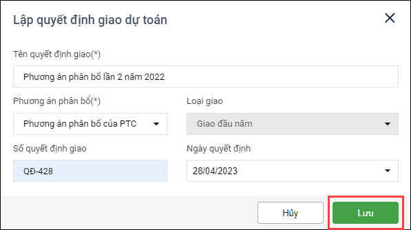 3. Trường hợp muốn giao phương án phân bổ này luôn thì nhấn Giao dự toán.