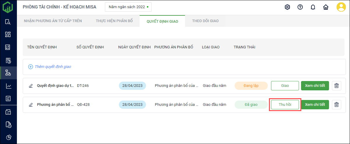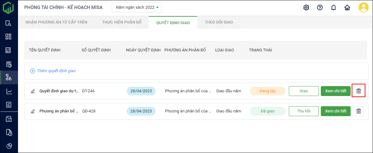 5. Trường hơp đơn vị muốn xóa quyết định giao đó, nhấn vào biểu tượng thùng rác để xóa. Nếu phương án đó đã được giao anh/chị chọn Thu hồi sau đó mới tiến hành xóa.
