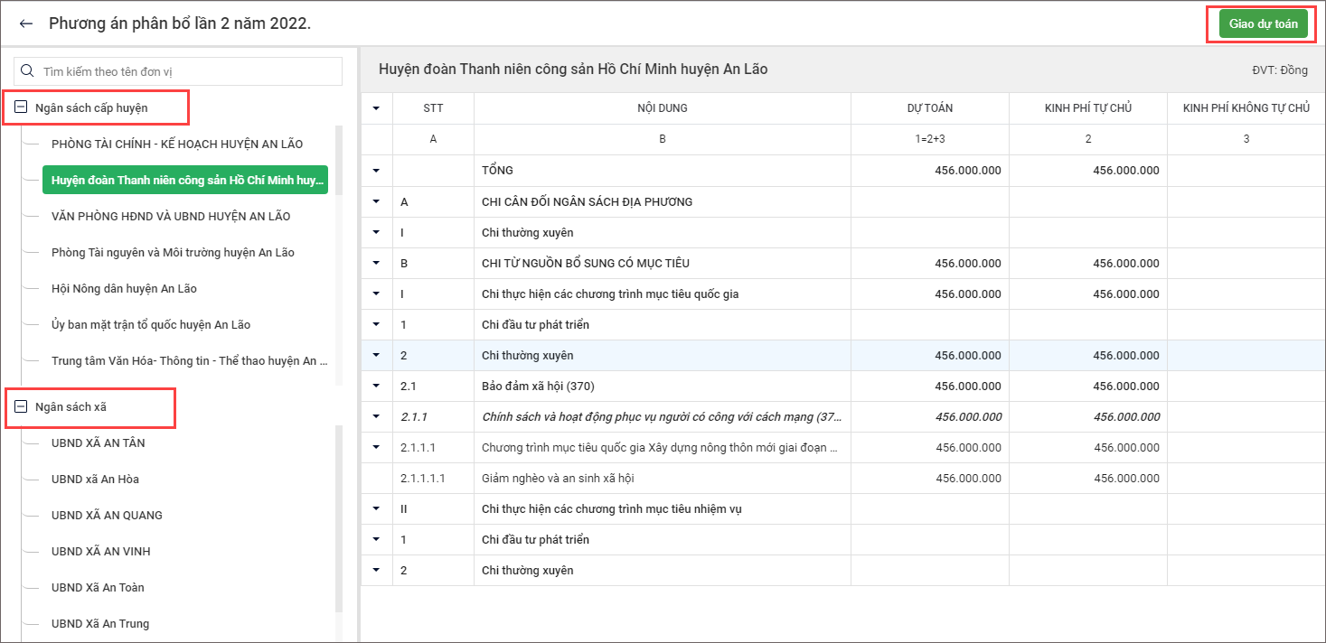 2. Chọn phần Ngân sách cấp huyện hoặc Ngân sách cấp xã để xem số dự toán được phân bổ cho các đơn vị thuộc địa bàn Phòng Tài chính.