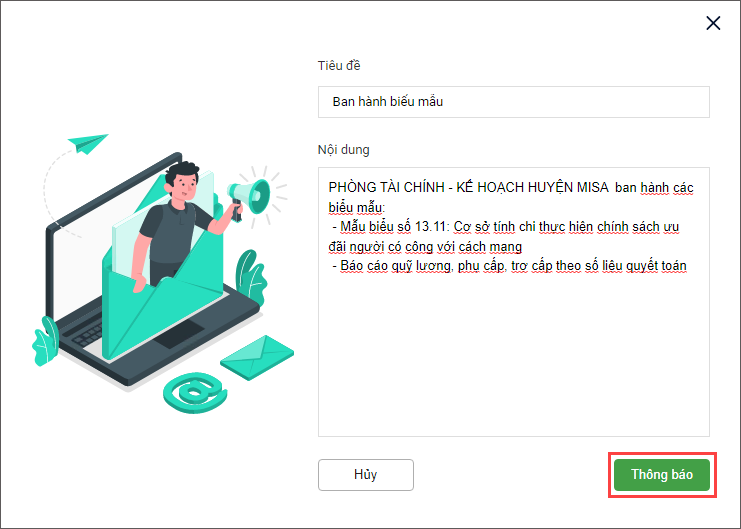 2.Nhập lại Tiêu đề Nội dung ban hành nếu muốn. Nhấn Thông báo để ban hành biểu mẫu xuống cho các đơn vị cấp dưới.