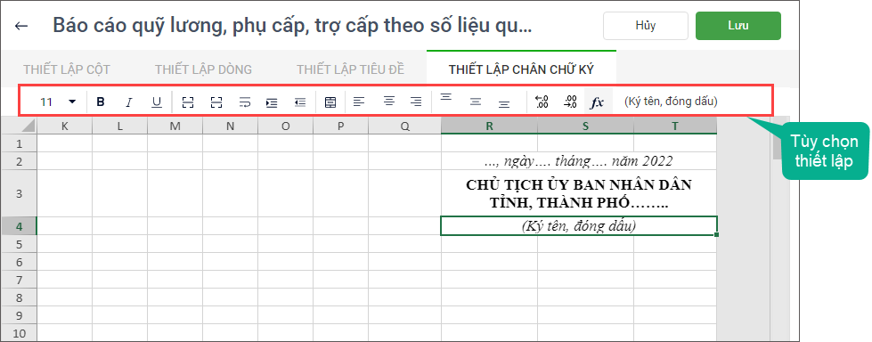 • Thiết lập chân chữ ký: Sử dụng các tùy chọn trên thanh công cụ để thiết lập.