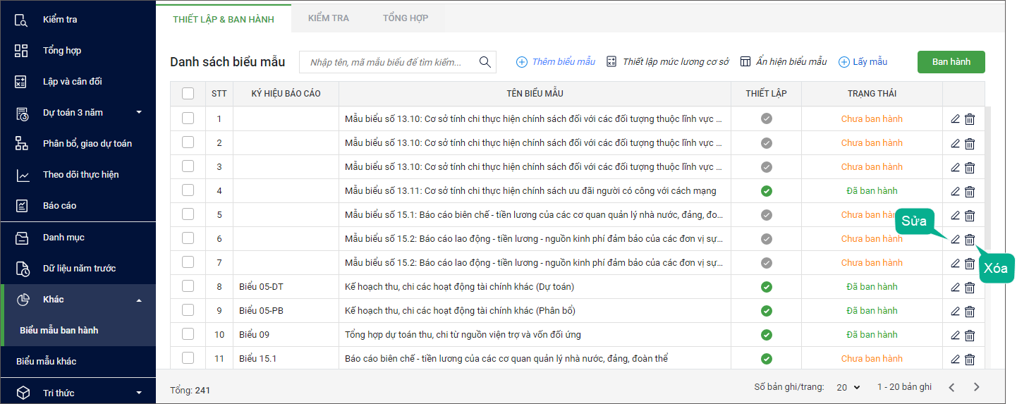 3. Đối với các biểu mẫu chưa ban hành, anh/chị có thể sửa hoặc xóa biểu mẫu.