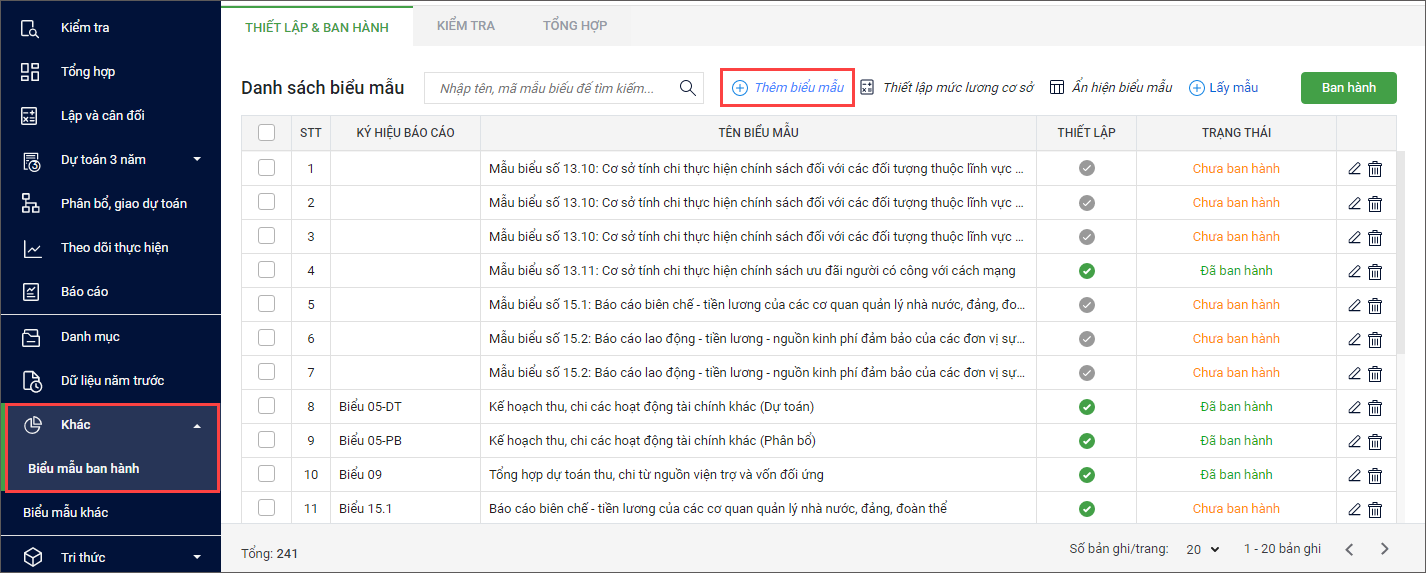Giúp Phòng tài chính thiết lập biểu mẫu và ban hành biểu mẫu xuống cho đơn vị cấp dưới.