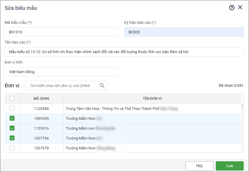 • Nhập Mã biểu mẫu, Ký hiệu báo cáo, Tên báo cáo, Đơn vị tính.