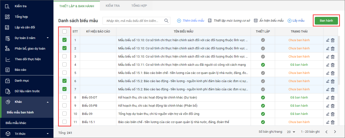 1. Tích chọn các biểu mẫu cần ban hành. Nhấn Ban hành.