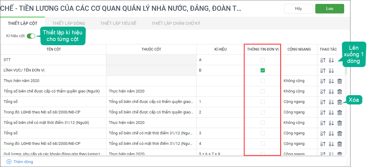 • Tích chọn Thông tin đơn vị vào dòng, cột có giá trị tương ứng (nếu có).