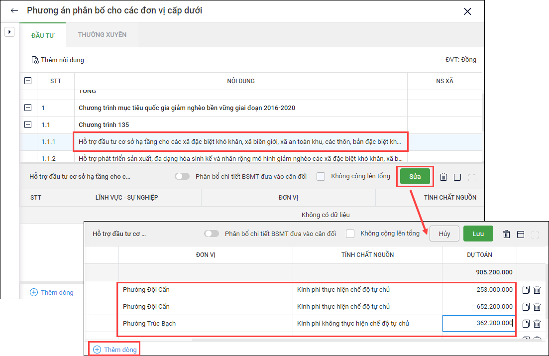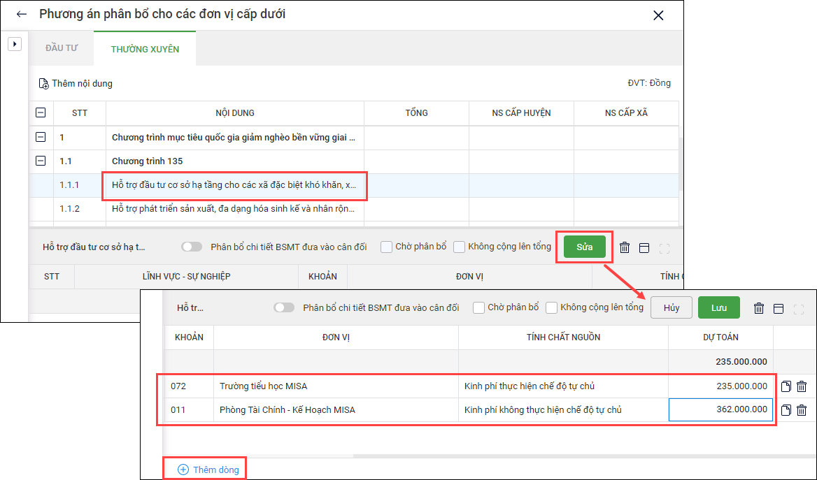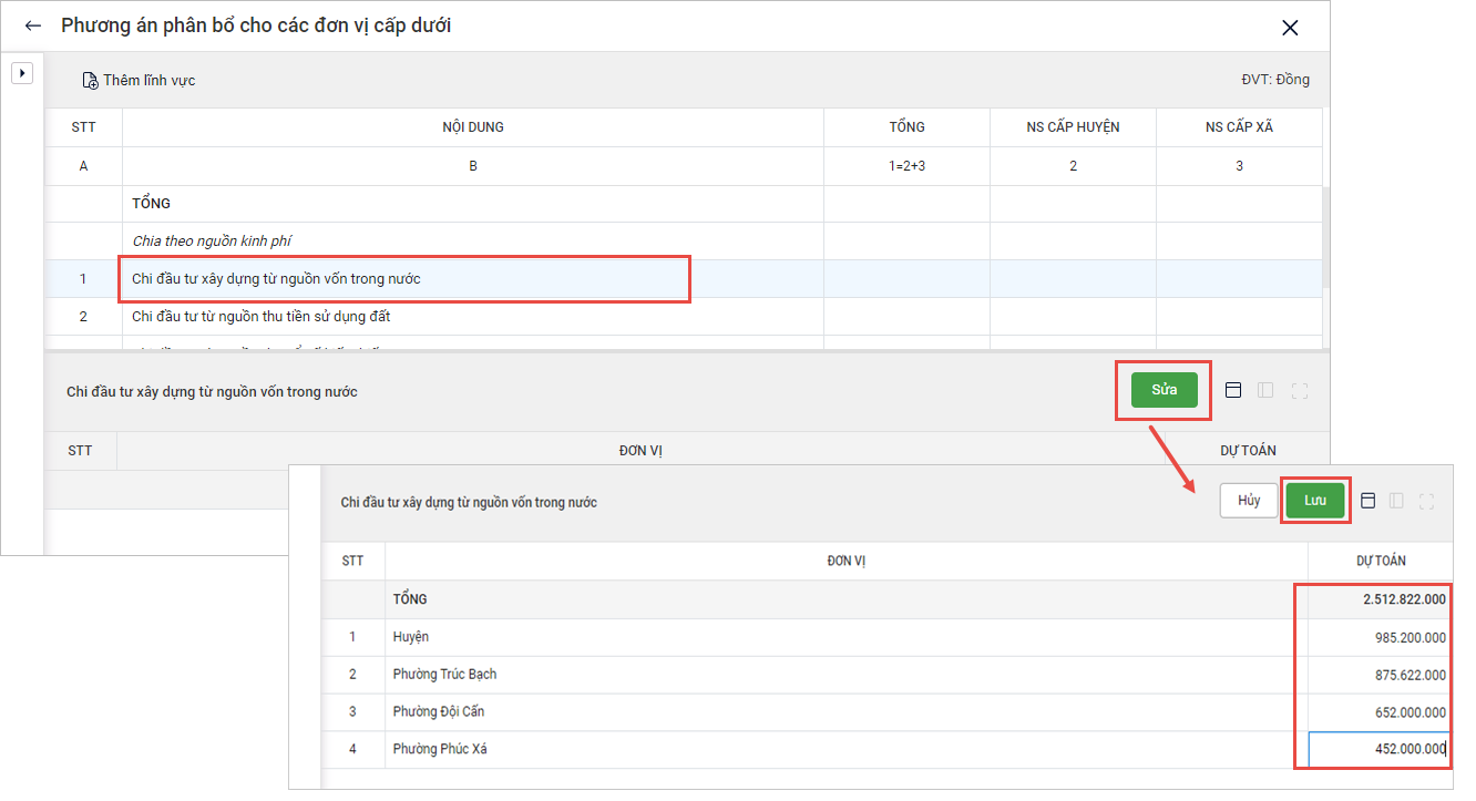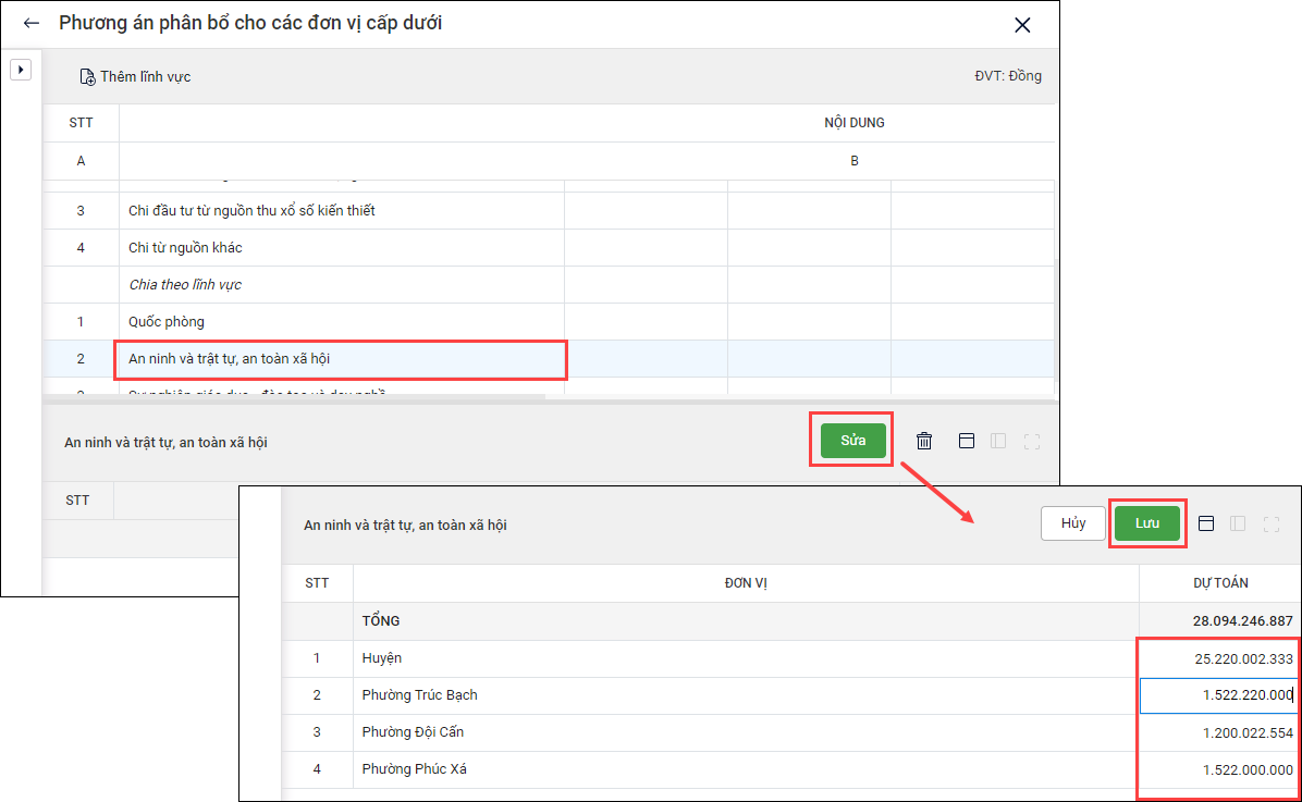 - Chọn lĩnh vực cần phân bổ dự toán, nhấn Sửa. Nhập số dự toán cho các đơn vị, nhấn Lưu.