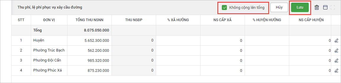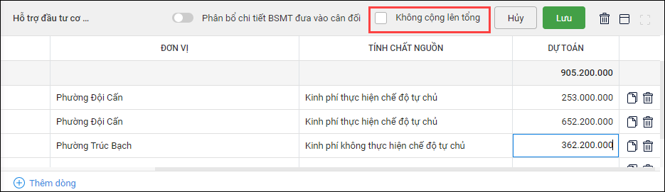 - Nếu anh/chị muốn số dự toán đó không cộng lên tổng số dự toán thì tích chọn Không cộng lên tổng và ngược lại.