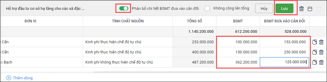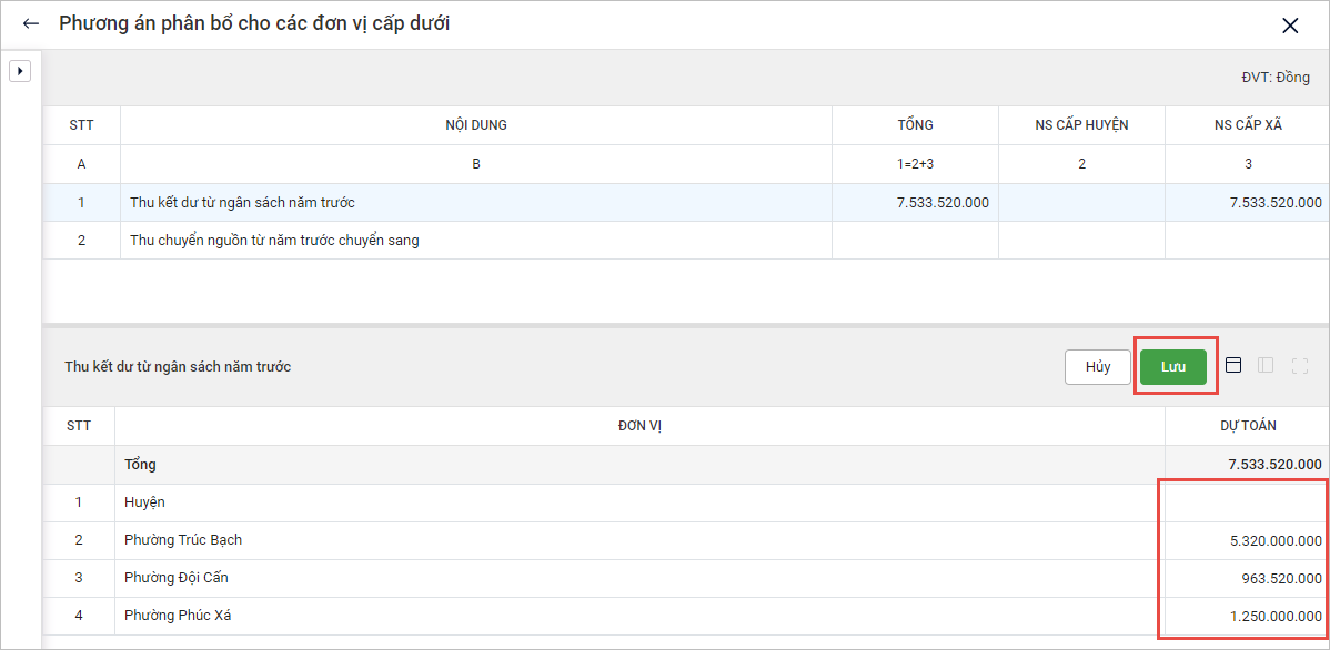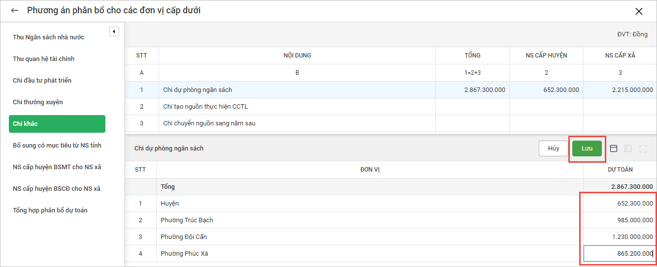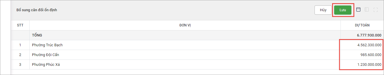 - Nhập số dự toán cho từng đơn vị. Nhấn Lưu.