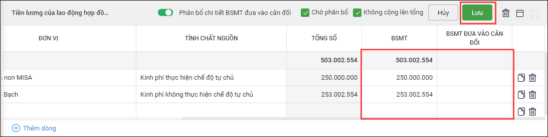 - Nếu đơn vị muốn thêm nội dung chi tiết để phân bổ dự toán, nhấn Thêm dòng hoặc Nhân bản. Nếu thêm nhầm nhấn vào biểu tượng thùng rác để xóa.