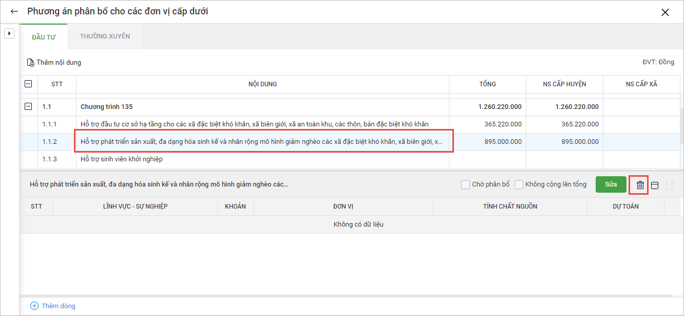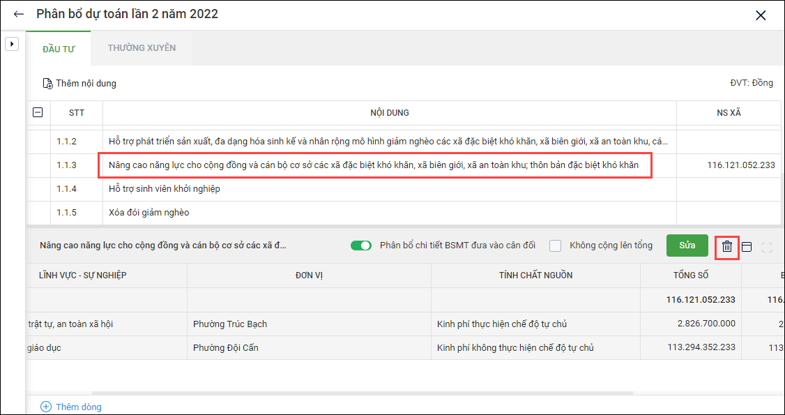 - Nếu đơn vị thêm nhầm nội dung chi thì chọn nội dung cần xóa và nhấn vào biểu tượng thùng rác để xóa.