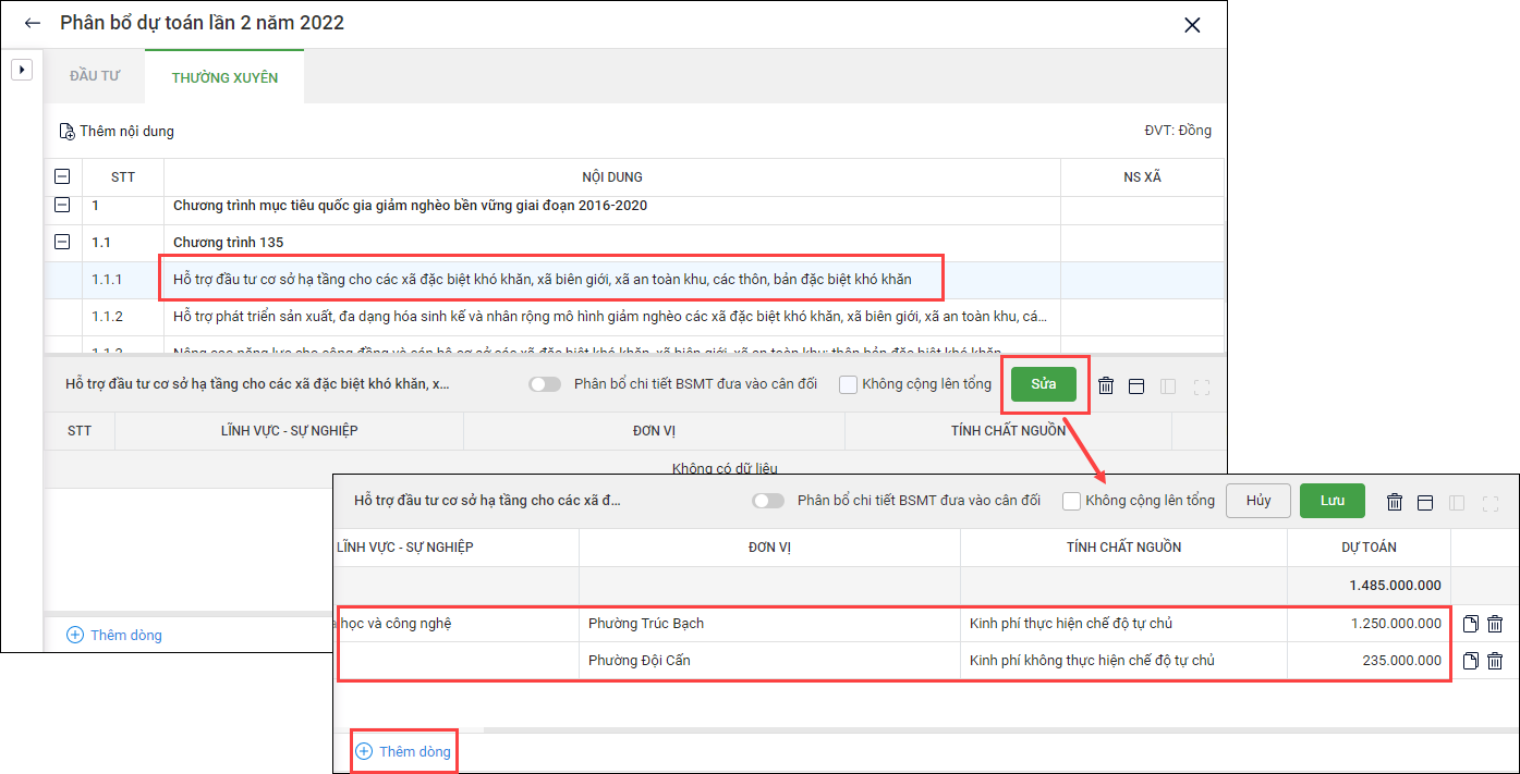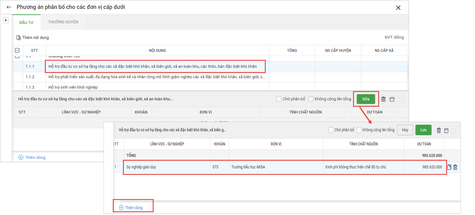 - Chọn nhiệm vụ con cần thực hiện phân bổ dự toán. Nhấn Sửa.