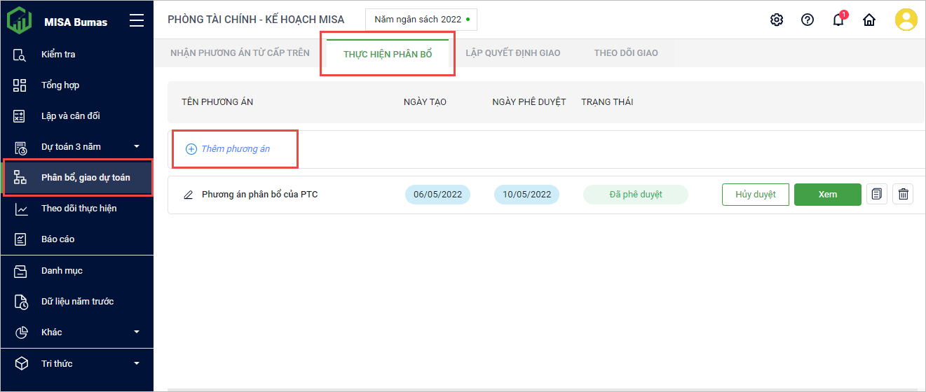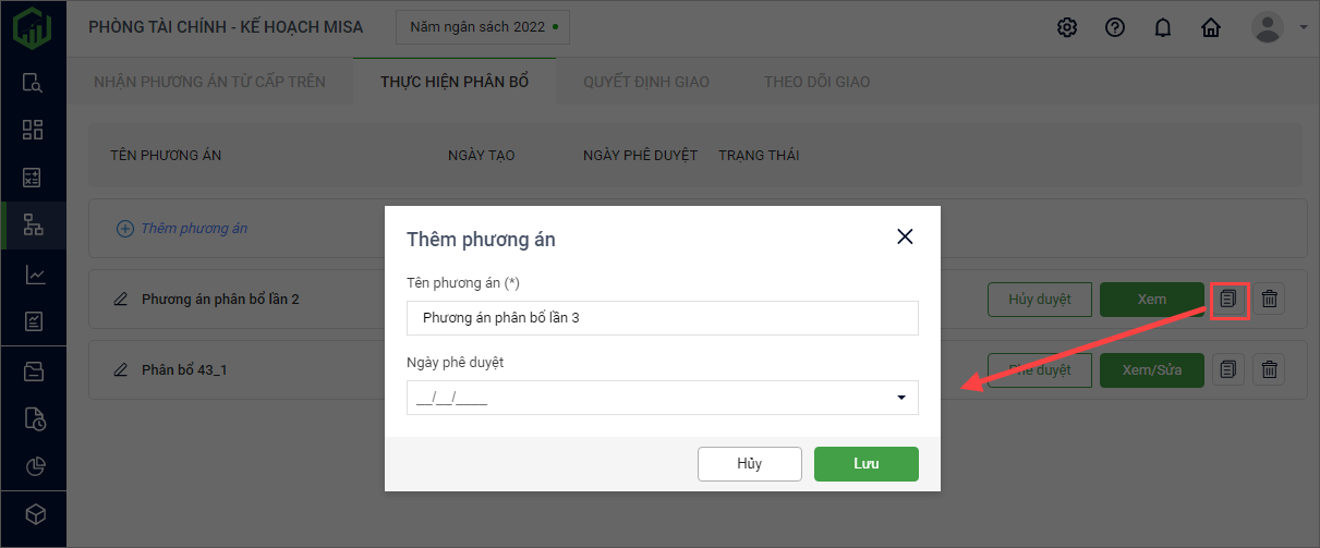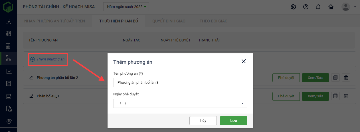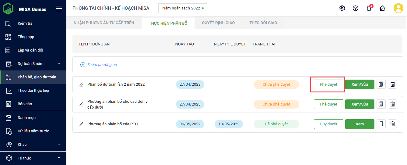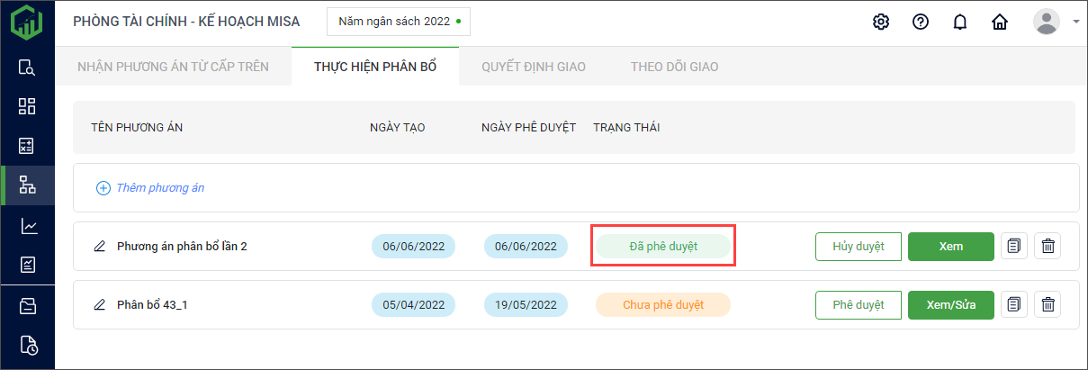 3. Sau khi nhập Ngày phê duyệt, phương án phân bổ sẽ tự động chuyển sang trạng thái Đã phê duyệt.