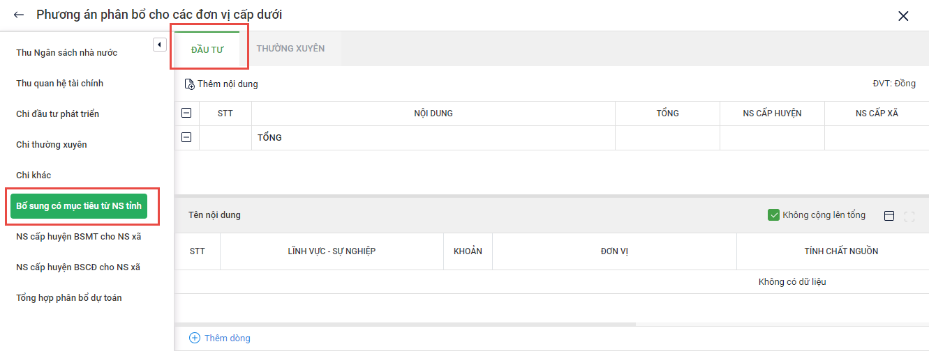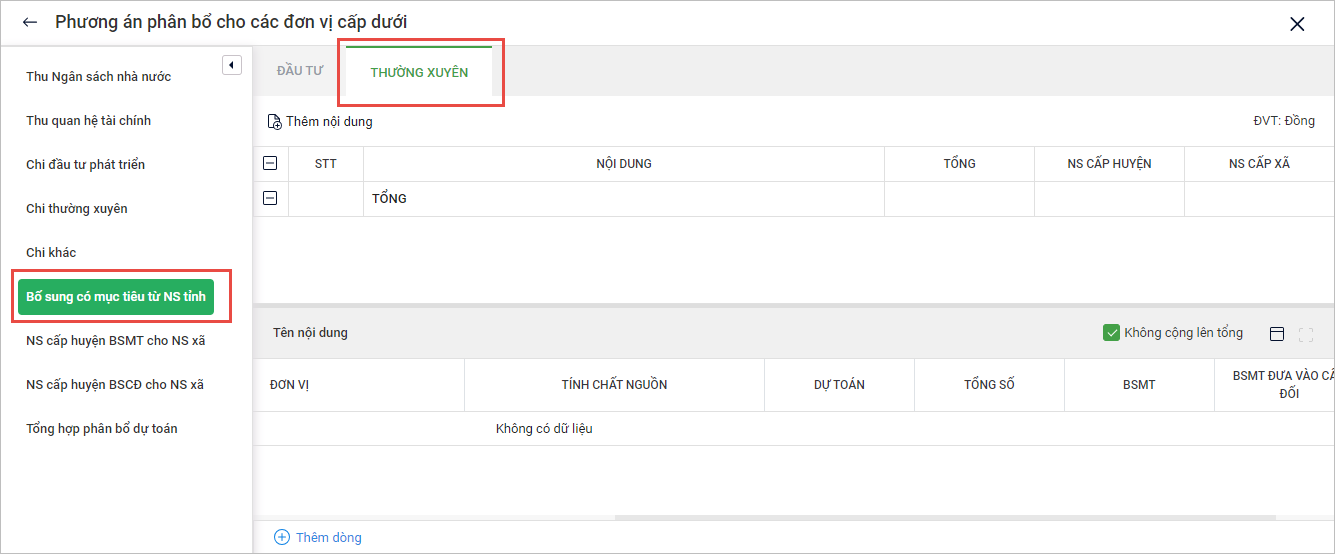 - Chọn tab Bổ sung có mục tiêu từ NS Tỉnh\Thường xuyên.