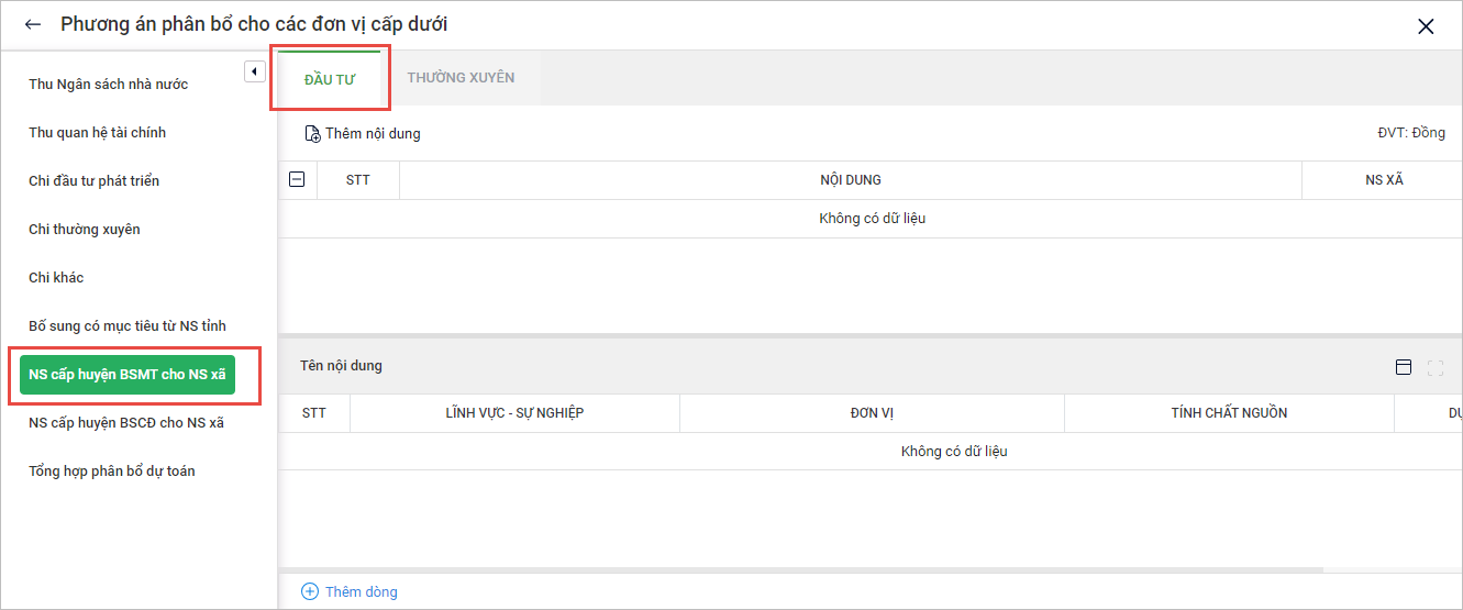- Chọn tab NS cấp Huyện BSMT cho NS Xã\Đầu tư.