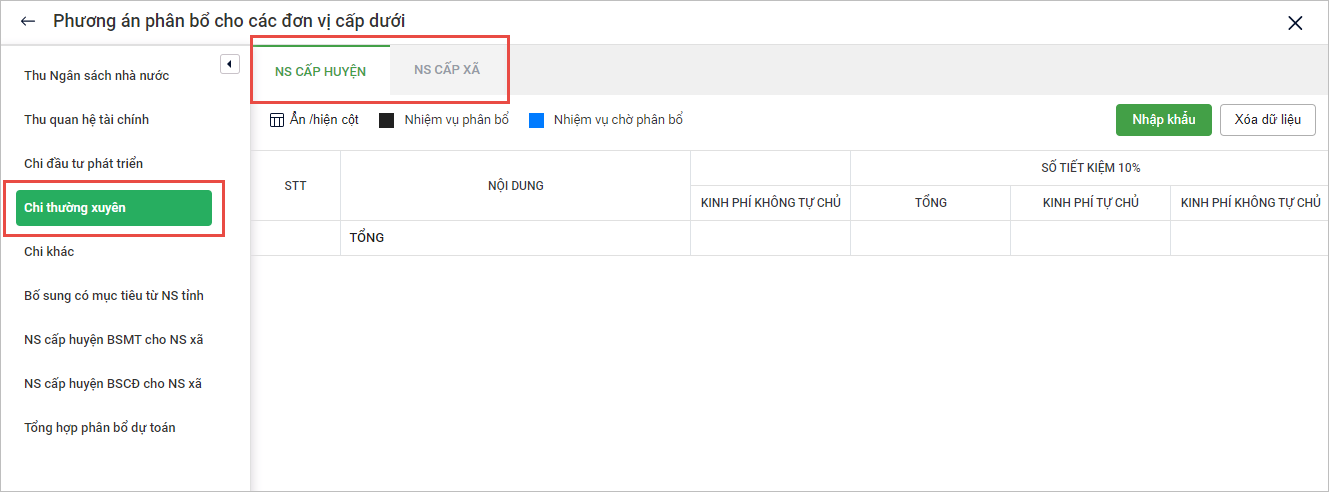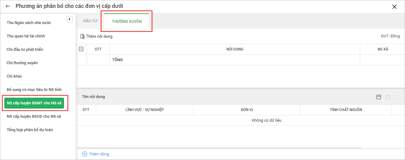 - Chọn tab NS cấp huyện BSMT cho NS xã\Thường xuyên.