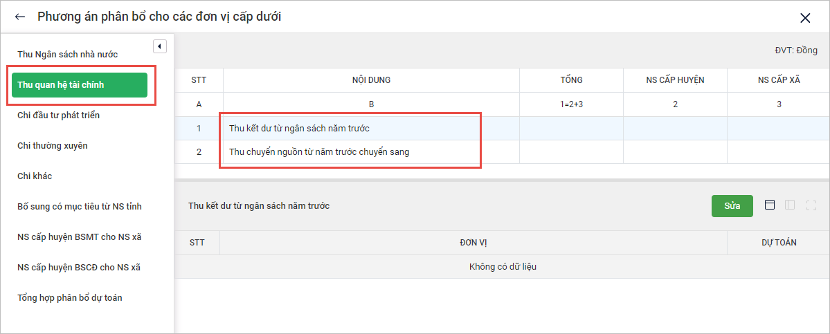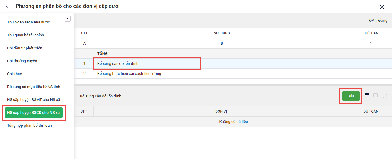 - Chọn nội dung đã được lấy lên để thực hiện phân bổ dự toán gồm: Bổ sung cân đối ổn định, Bổ sung thực hiện cả cách tiền lương. Nhấn Sửa.