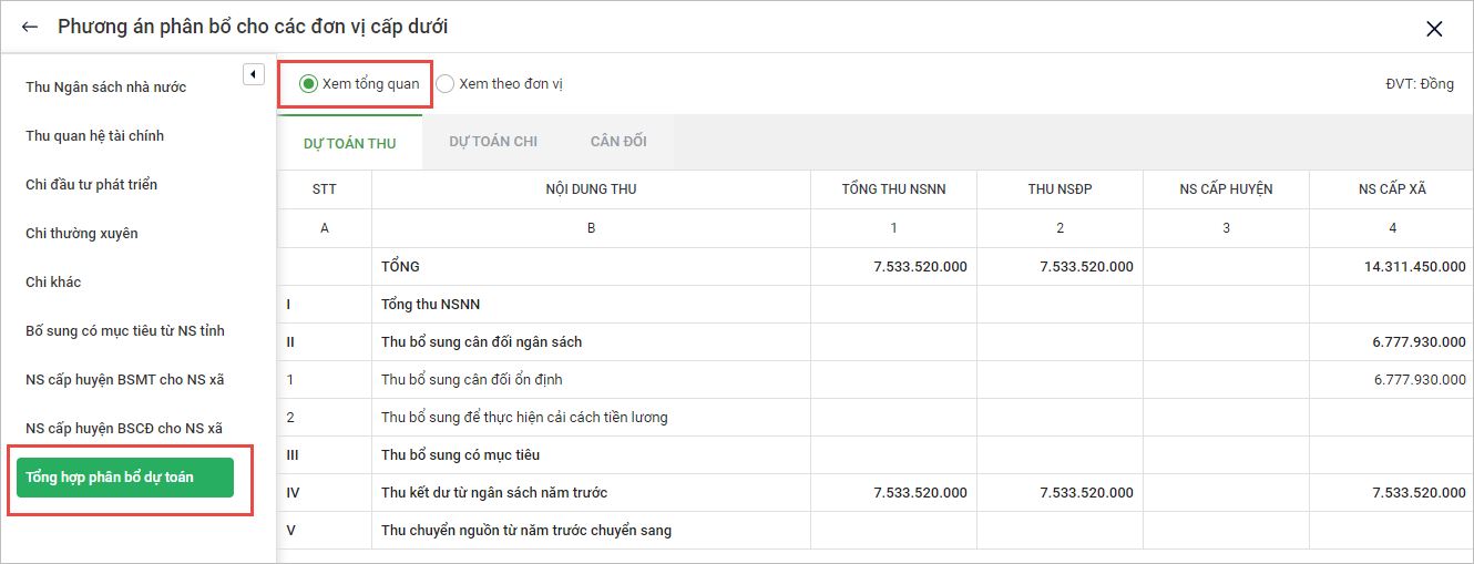 - Anh/chị có thể xem được nội dung phân bổ của Dự toán thu, Dự toán chi và Cân đối.
