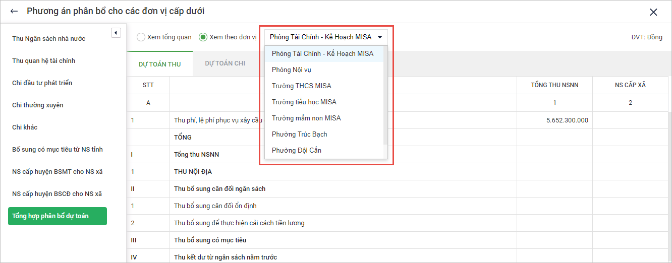 - Nhấn vào Xem theo đơn vị và chọn đơn vị để xem số liệu phân bổ của đơn vị đó.