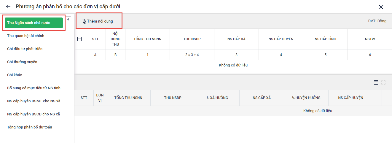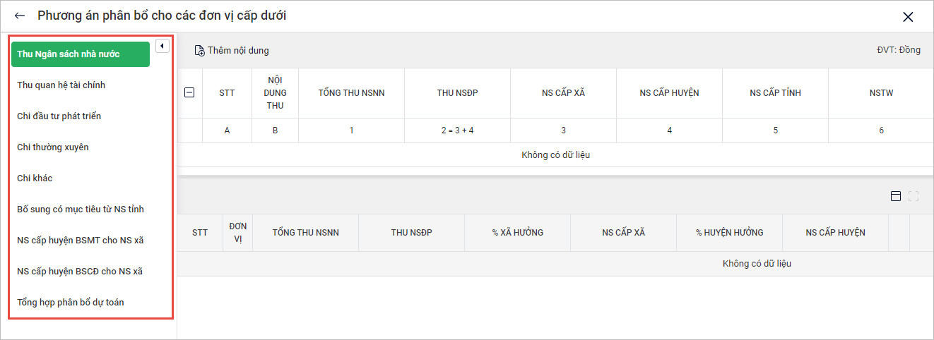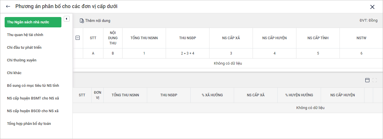 5. Thực hiện phân bổ cho các đơn vị theo các nội dung sau: Thu Ngân sách nhà nước, Thu khác, Chi đầu tư phát triển, Chi thường xuyên, Chi khác, Bổ sung có mục tiêu từ NS tỉnh, NS cấp huyện BSMT cho NS xã, NS cấp huyện BSCĐ cho NS xã, sau đó phần mềm tự động Tổng hợp phân bổ dự toán.