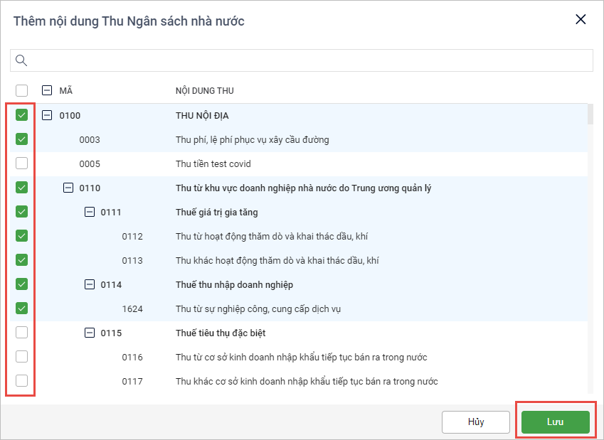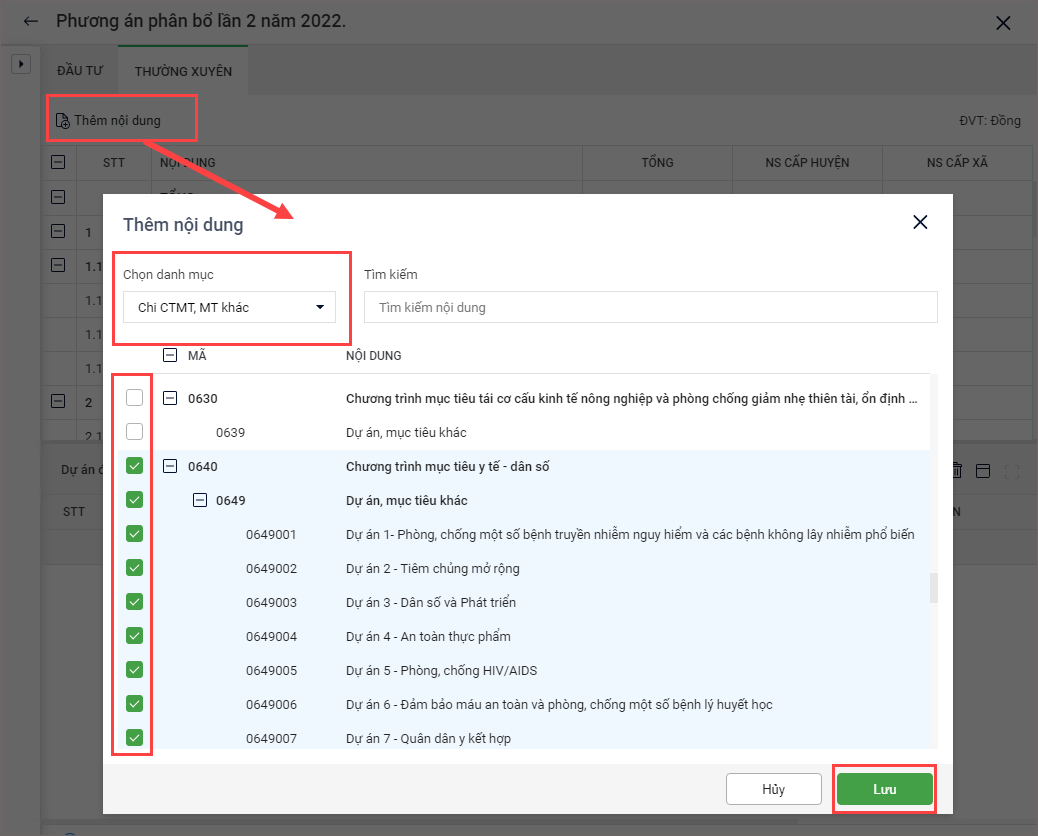 - Tích chọn nội dung cần phân bổ dự toán cho đơn vị cấp dưới. Sau đó nhấn Lưu.