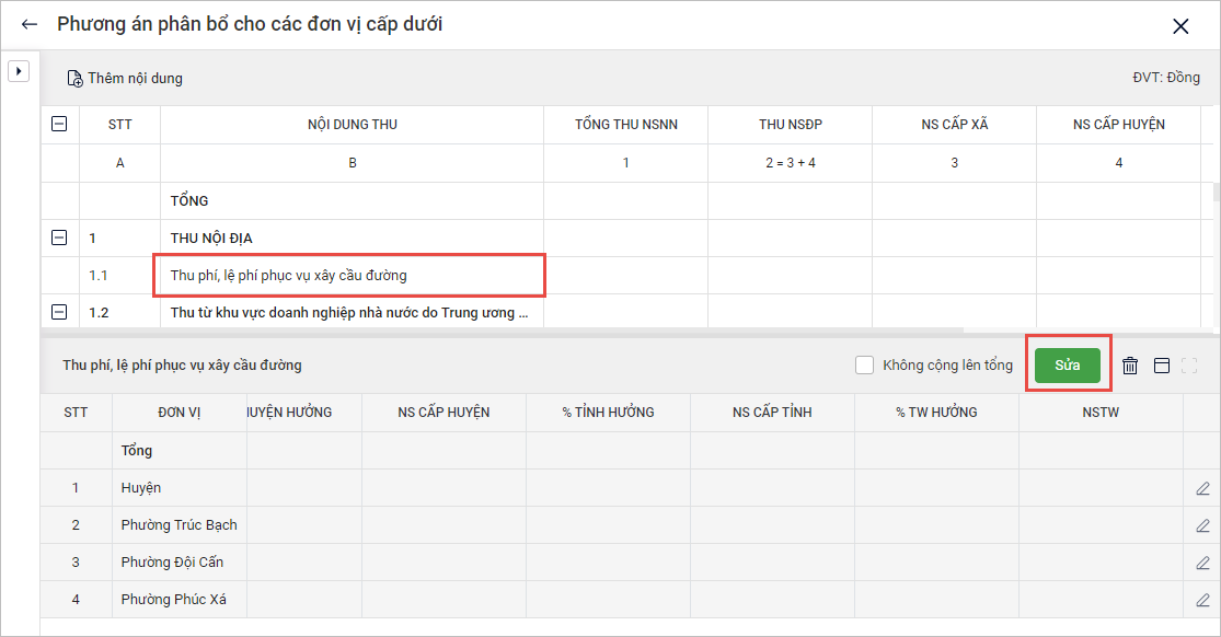 - Chọn Nội dung thu cần phân bổ dự toán. Nhấn Sửa.