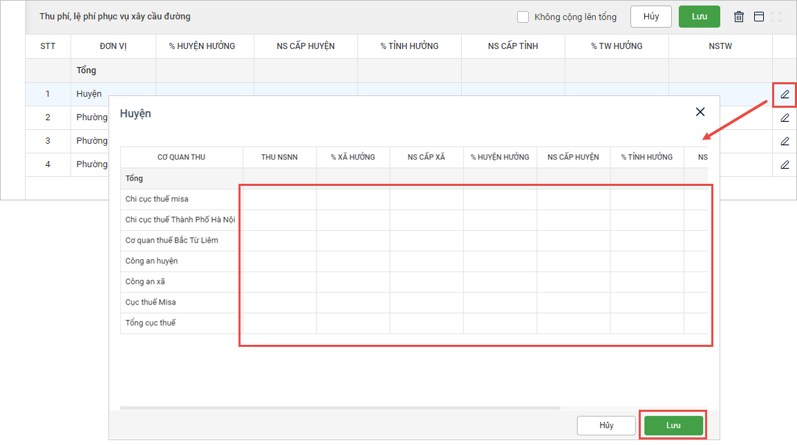 - Nếu đơn vị muốn phân bổ số dự toán theo cơ quan thu, chọn biểu tượng cây bút tại dòng đơn vị cấp dưới cần phân bổ số dự toán. Nhập thông tin cho bảng phân bổ số dự toán theo cơ quan thu, nhấn Lưu.