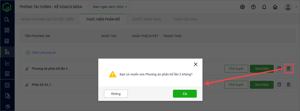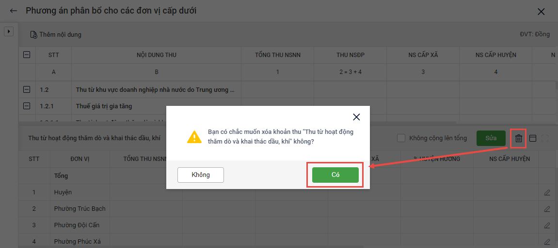 - Trường hợp muốn xóa nội dung nào trên bảng phân bổ, nhấn vào biểu tượng thùng rác. Nhấn Có để chắc chắn muốn xóa.