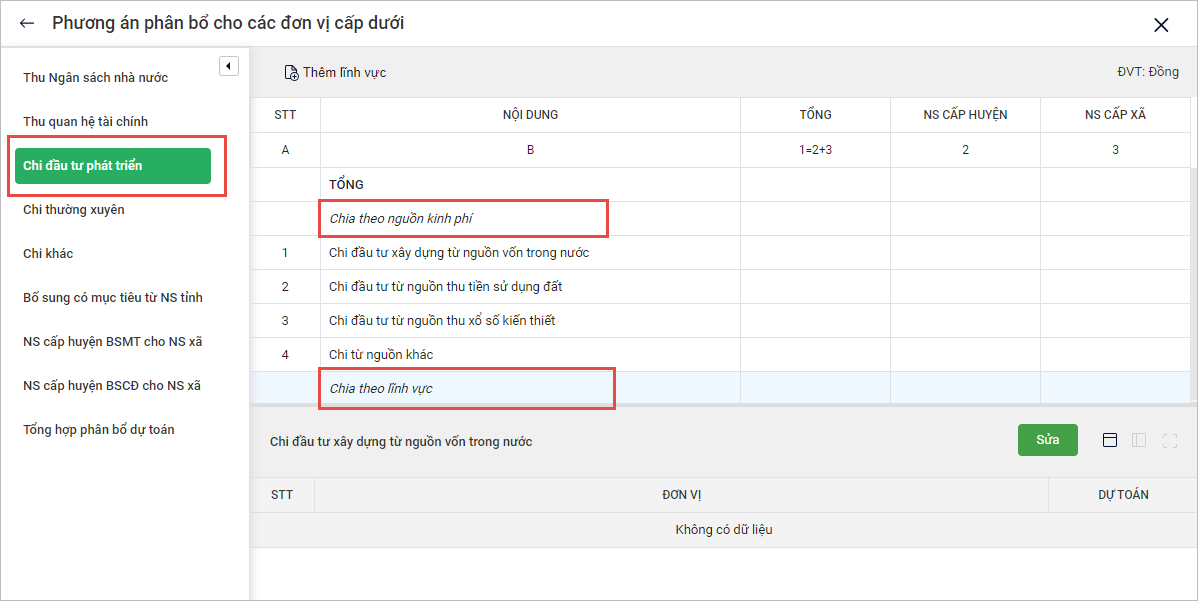 - Đối với phân bổ Chi đầu tư phát triển cần thực hiện phân bổ theo 2 nội dung: Chia theo nguồn kinh phí và Chia theo lĩnh vực.