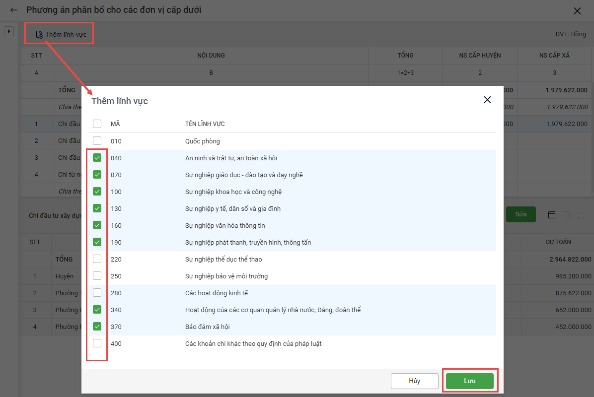 - Chọn Thêm lĩnh vực, tích chọn các lĩnh vực để phân bổ dự toán, nhấn Lưu.