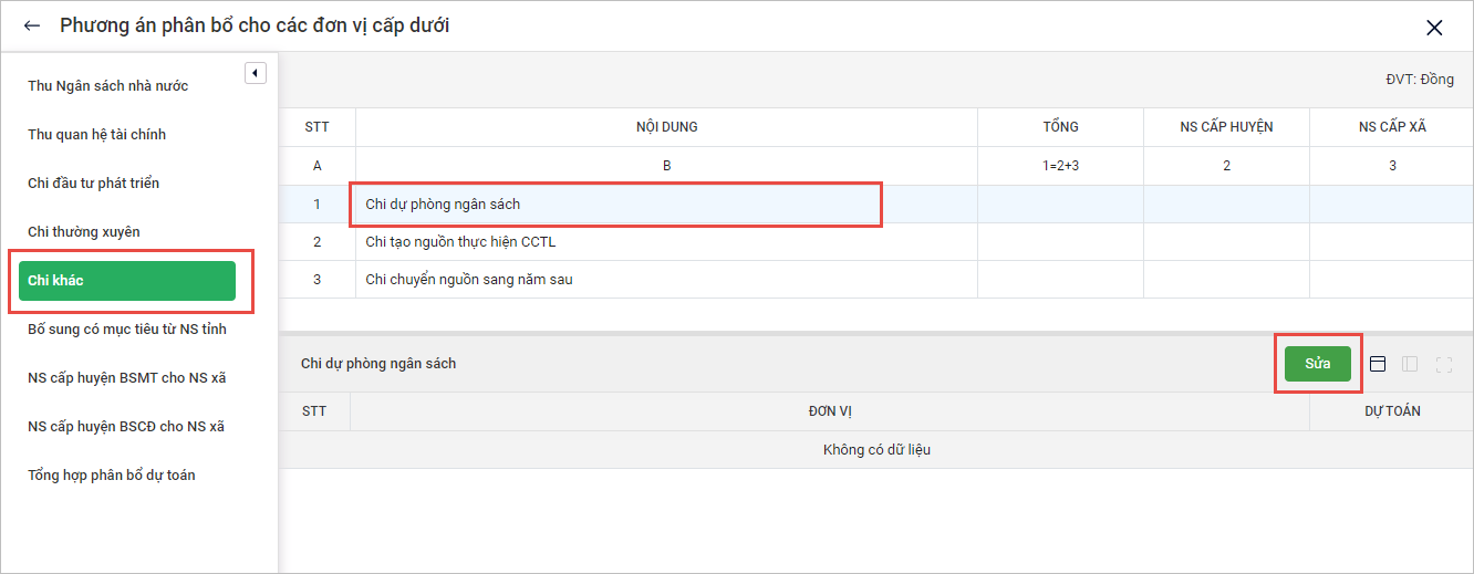 - Chọn nội dung chi cần phân bổ dự toán. Nhấn Sửa.